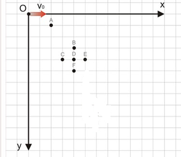 Uma pequena esfera é lançada horizontalmente do ponto O, passando pelo ponto A 1 s após o lançamento (t = 1 s). Considere a aceleração da gravidade constante e despreze os atritos. Entre os pontos indicados, quais deles representam a posição da esfera no instante