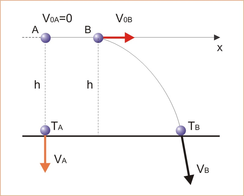 Uma pedrinha A é abandonada (v0A = 0) de um ponto situado a uma altura h do solo. No mesmo instante, outra pedrinha B é lançada horizontalmente , da mesma altura h e com velocidade v0B. Sejam TA e TB os instantes em que as pedrinhas atingem o solo e vA e vB os módulos de suas velocidades, nestes instantes. Despreze a resistência do ar e considere g constante.