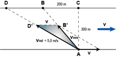 Um barco desloca-se num rio de margens paralelas, cuja correnteza tem velocidade constante V. A velocidade do barco, em relação às águas é de 5,0 m/s. O barco parte de A e atinge a margem oposta em B, conforme indica a figura abaixo.